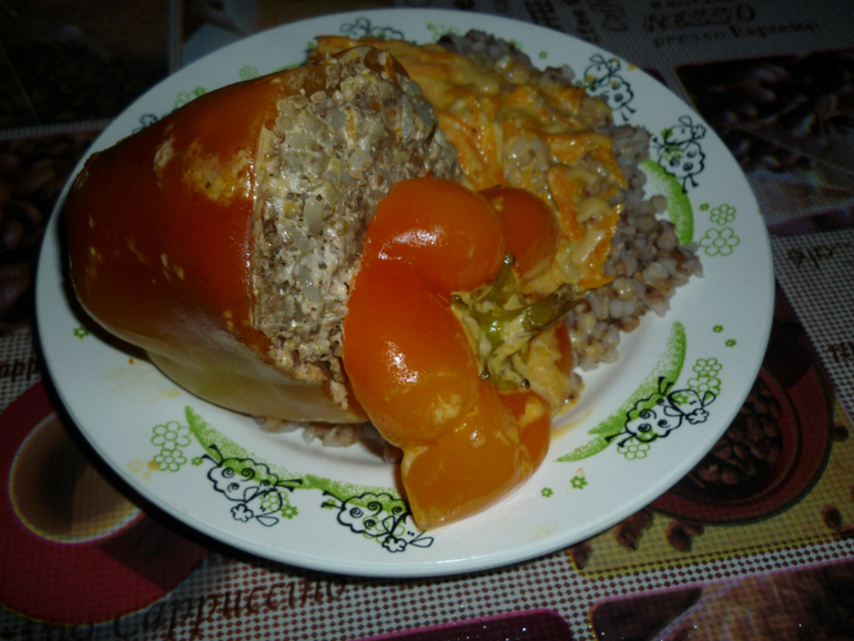 Муж всегда и все ест с гарниром))Перцы фарширую-фарш+рис предварительно отваренный до полуготовности+обжаренный лук с морковью+перец и соль. Выкладываю на подложку из дукат моркови и заливаю соусом-сметана+ томатная паста+поварские травы и немного кипяченой воды. Готовить минут 40 на среднем огне. Приятного)