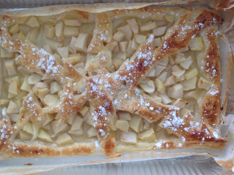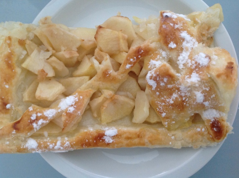 Тесто разморозить, пласт выложить на противень с бумагой для запекания. Края завернуть, смазать взбитым яйцом. Яйцо слегка взбиваем вилкой. Нарезать мелко яблоки, я их чищу от кожуры. Разложить яблоки на тесто, посыпаем сверху коричневым сахаром и карамелью. Ставим в духовку на 25-30 минут при 180 градусах. Духовку предварительно разогреть. Вынимаем пирог и остывший посыпаем сахарной пудрой. Радуйте своих домашних))