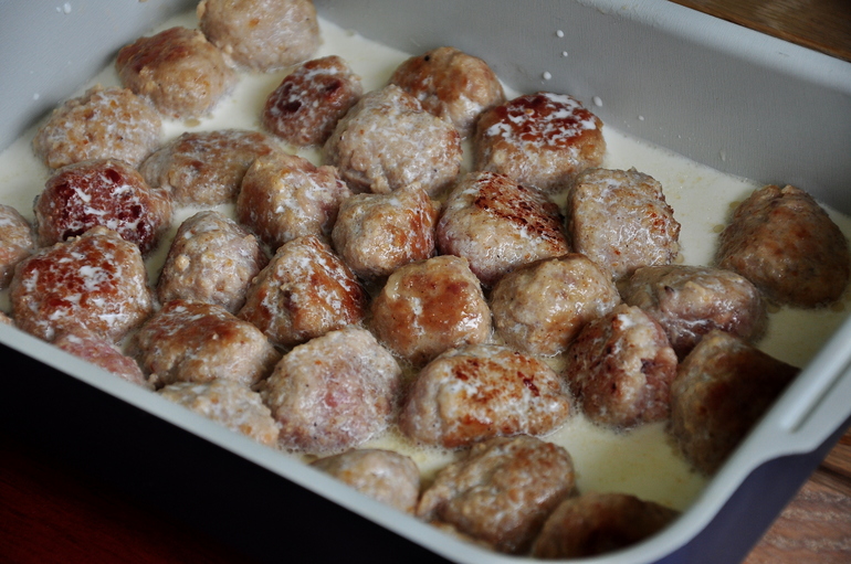 Выкладываем фрикадельки на противень, заливаем сливками.
