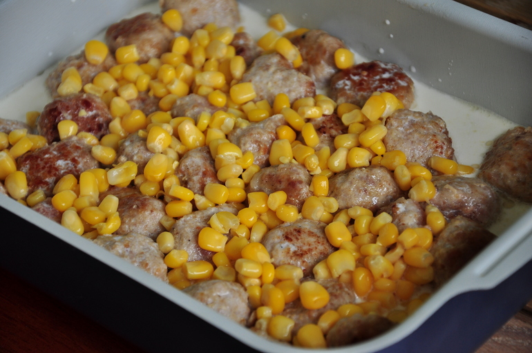 Фрикадельки получаются наивкуснейшими, очень сочными и нежными, кукуруза оказалась очень хороша в компании сыра и сливок.