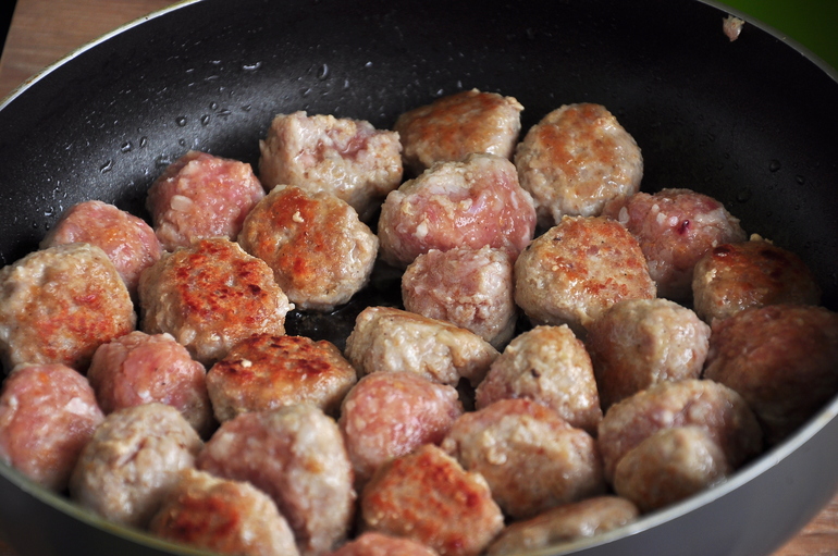 Мокрыми руками, скатываем фрикадельки и обжариваем на разогретой сковороде до румяного цвета.