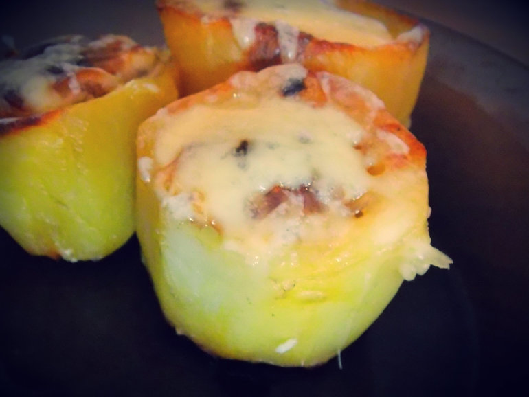 Сам рецепт, как и набор продуктов, очень прост. Картофель, фарш и сыр. Из одной средней картофелины получается 1 бочонок. У меня картофель был крупный, разрезала поперёк пополам - на 2 бочонка. Немного срезаем донышко, чтоб, так сказать, уверенно стоял, вырезаем серединку. Сам картофель я немного посолила. Начиняем фаршем. Я на дно ёмкости для запекания поместила пергаментную бумагу (думаю, можно вместо этого и маслом смазать), чтоб не так жирно было. Расставила бочонки. Чтобы блюдо не получилось пересушенным - накрыла фольгой - и в разогретую духовку. Время, честно, не засекала. Думаю, минут за 40 всё приготовилось. Проткнула картофель - мягкий. Убрала фольгу, минут ещё за 10 подрумянилось. Выключила огонь и посыпала тёртым сыром. Как сыр расплавится - кушать подано))))