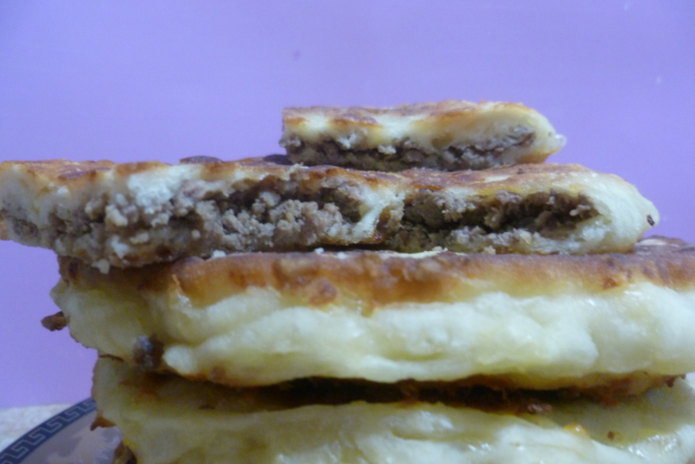3. Полученное тесто разделить на колобки, раскатать небольшую лепешку (можно пожарить так), положить начинку