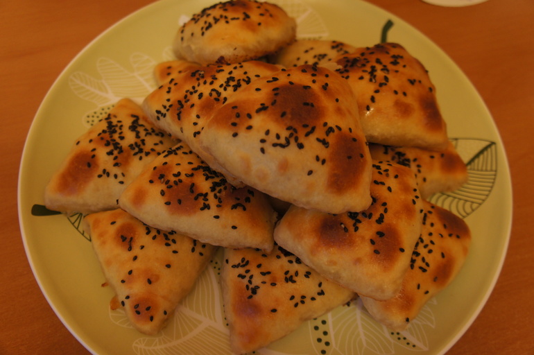 на кружок теста выложить столовую ложку фарша, кусочек сливочного масла, защипать треугольником, смазать яйцом, посыпать кунжутом.
