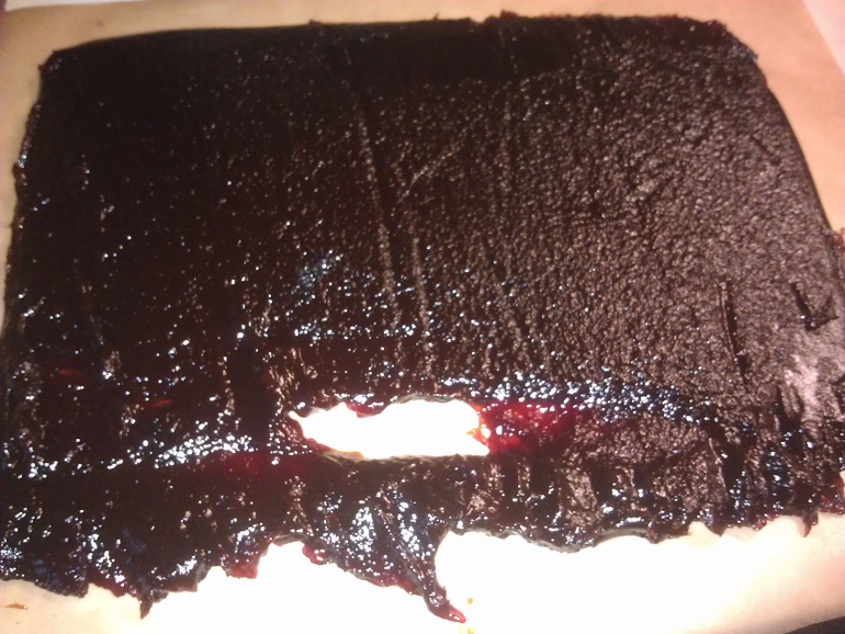 Потом все это дело вылила я на противень с пергаментной бумагой и стала сушить. Сутки сушила на одной стороне и еще сутки на другой. Потом порезала и обваляла в сахаре и кокосовой стружке.
