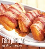 Сыр нарезать такими же прямоугольниками. Положить сыр между двумя кусочками тыквы. Разогреть духовку до 190°С. Обернуть каждый сэндвич беконом, поместить на противень и запекать, 10 мин.