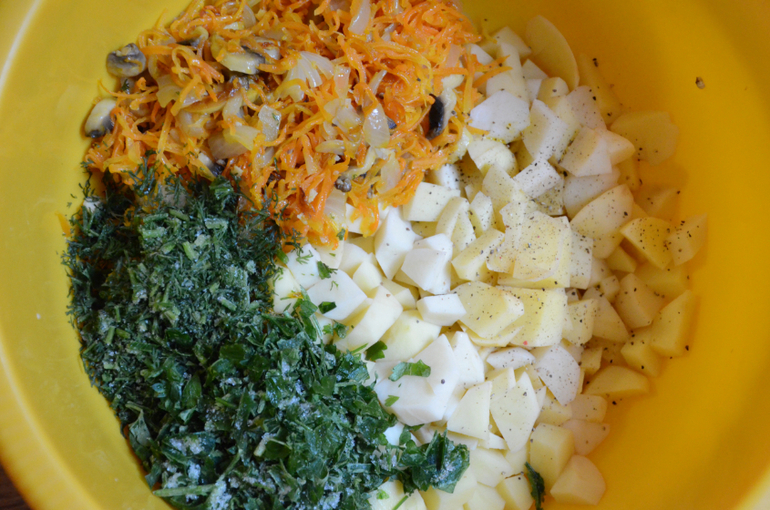 4) Помещаем нашу овощную смесь в миску с картофелем, добавляем зелень, майонез (лучше приготовьте свой вегетарианский) или сметану, солим по вкусу, перемешиваем.