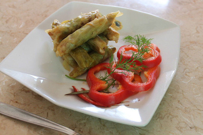Скручиваем трубочки из листей, внутри фарш с рисом