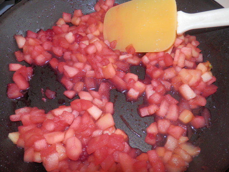 Начинку готовим так: Яблоки очищаем от кожуры, мелко режим и обжариваем на сливочном масле с сахаром и добавлением сока малины, до мягкости...минут 5-7, на среднем огне.
