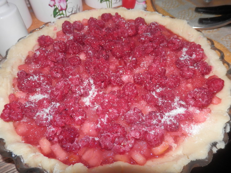 На него выкладываем начинку. Я к яблокам добавила еще свежую малину и присыпала сахаром.
