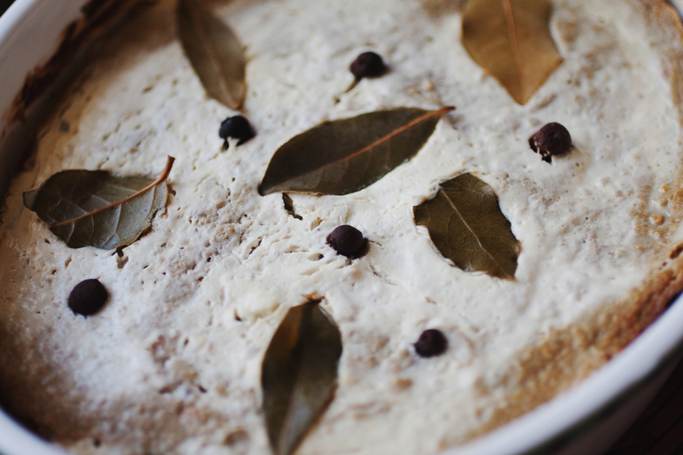 Смешать печень с поджаркой, добавить 1 яйцо и все это в блендер. разлить по формам, помазать сметаной. сверху можно положить лавровый лист и перец. Далее все запекается 40 мин в духовке, разогретой до 180 град.