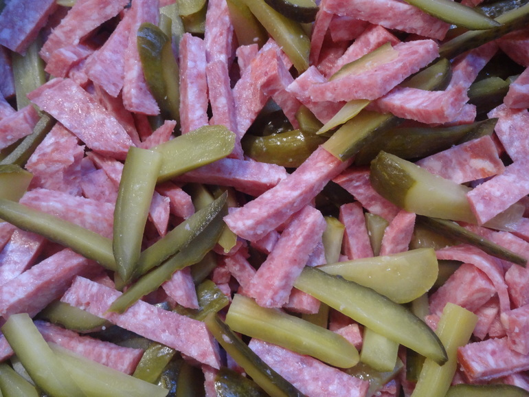 1. Колбасу и огурчики нарежьте тонкой соломкой. Лук почистите, нарежьте тонкими полукольцами. Сыр нарежьте кубиками.