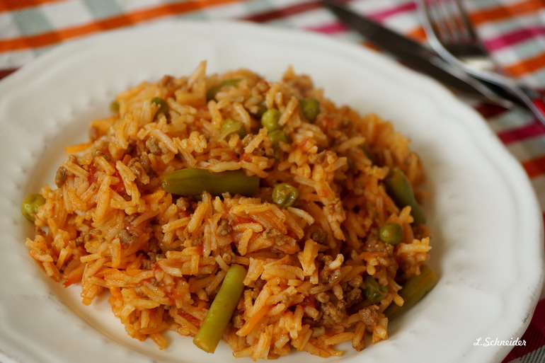 Рис с фаршем, стручковой фасолью и свежим зеленым горошком