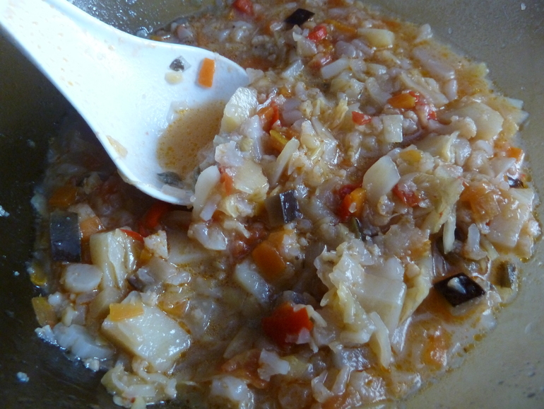 На небольшом кол-ве масла обжарить лук и морковь, потом добавить порубленный соломкой перец, ещё немного пожарить. Добавить мелко нарезанный помидор с соком. Ещё пару минут пожарить. Добавить все остальные овощи, посолить, залить водой так, чтоб не закрывала полностью овощи. Тушить 1-2 часа(по вкусу).