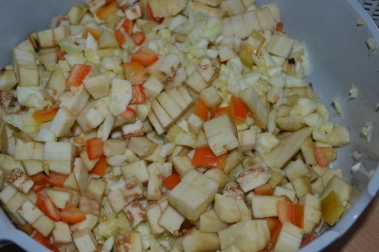 Делаем как на фото! Вычищаем внутри кабачок и мелко режем,так же режем баклажан и перец. Лук обжариваем до золотистой корочки и выкладываем нарезанные овощи ,все это тушим на большом огне пока не испарится жидкость.