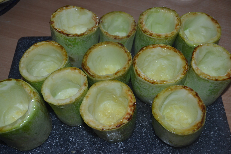 Кабачки обжариваем сверхней стороны и добавляем приготовленные овощи в кабачки. Сверху кладем сыр и выкладываем на сковородку и накрываем крышкой на медленный огонь. Время точно сказать не могу ,надо чтобы они поджарились с низу и растаял сыр.