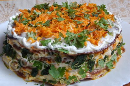 На подготовленное блюдо уложить печеночный блин, смазать его чесночным майонезом, положить обжаренные лук и морковь и посыпать рубленой зеленью (можно положить, порезанный кубиками или соломкой, болгарский перец).