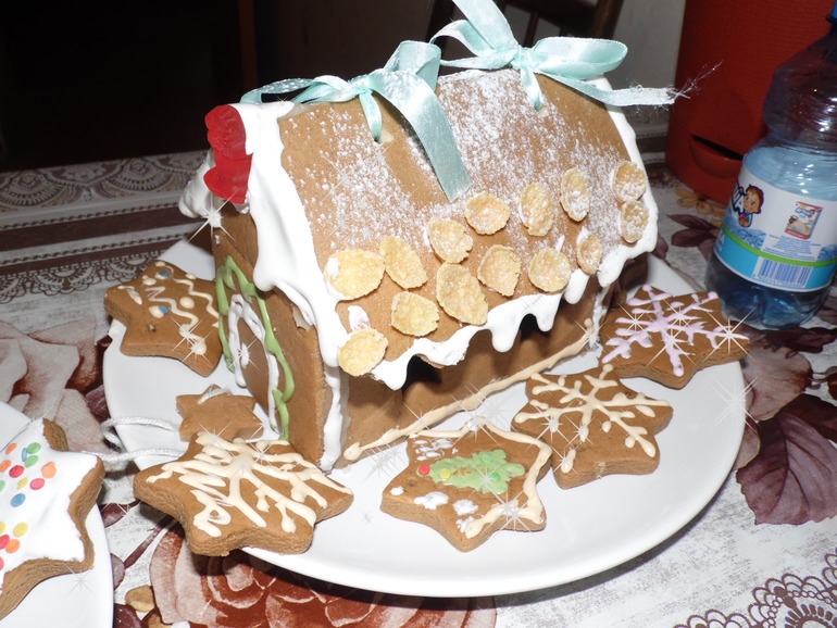 тесто: 400гр меда,2 яйца, 250гр.сливочного масла,200гр коричневого сахара+150гр белого2ст.ложки какао2ч.л разрыхлителя2ч.л корицы2ч.лванилинГОТОВИМ:масло+сахар коричневый и белый+мёд растопить на огне но не кипятить пока остужается мешать чтоб сахар растаяляйца слегка взбить и ввести в остывшую чуть теплую маслянистую массудалее замесить тесто как на пельмени должно получится но не крутое! убрать в холодильник,лучше всего вечером приготовить чтоб на ночь оставить! айсинг готовим так 2 яйца+ постепенно доюавляем сахарную пудру при взбивании 250гр всего,это вам вместо снега будет и рисование на домике, в него можно добавить пищевые красители на вашу фантазию)