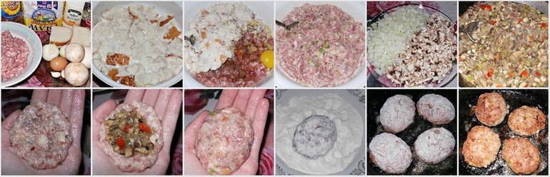 Вначале приготовим грибную начинку для котлет. Для этого грибы нужно тщательно промыть водой, обсушить и нарезать небольшими ломтиками.Репчатый лук очистить, промыть, обсушить и нарезать маленькими кубиками.На сковороде в небольшом количестве растительного масла сначала обжарить нарезанный лук до мягкости.Затем добавить к луку подготовленные грибы,добавить 1-2 ст.л сметаны, всё это перемешать и продолжать обжаривать, периодически помешивая, пока не выпарится вся жидкость. В конце жарки грибы с луком посолить и поперчить по вкусу. Снять с огня и дать остыть. На этом грибная начинка для котлет готова.В мясной фарш вбить яйцо, добавить белый хлеб (без корок), предварительно размоченный в воде или молоке. Также, по желанию, можно добавить в фарш измельчённый чеснок.Фарш хорошо перемешать руками, добавить соль и специи по вкусу.Мокрыми руками (для того, чтобы фарш не прилипал) сформировать небольшую плоскую лепешку из фарша. В центр выложить остывшую начинку из грибов и лука.Сверху положить такую же лепешку из фарша и сформировать круглую котлету. Проследить, чтобы начинка была хорошо закрыта фаршем, иначе котлеты при жарке могут «разъехаться». Сформировать все котлеты, затем обвалять их в муке.Разогреть сковороду с растительным маслом, выложить котлеты с грибами и обжаривать на среднем огне.Когда котлеты зарумянятся, аккуратно перевернуть их лопаткой и продолжать обжаривать с другой стороны. Когда котлеты покроются золотистой корочкой со всех сторон, огонь сделать минимальным, накрыть сковороду крышкой и довести до полной готовности.Зразы с грибами готовы!Приятного аппетита!