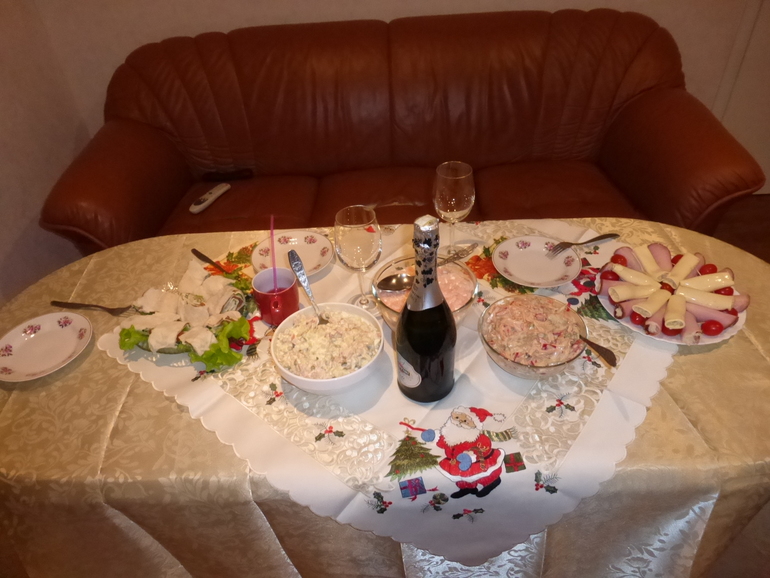 P.S. Стол собирала за 15 мин до курантов, и мой мелкий таракан успел подправить расположение скатертей и приборов :)