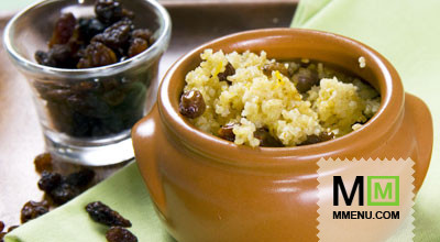 крупа пшеничная - 100 граммов, сок яблочный - 2 стакана, изюм - 2 ст. ложки, цедра апельсина тертая - 2 ч. ложки, масло сливочное - 2 ст. ложки, сахар - 2 ч. ложки, соль - по вкусу.