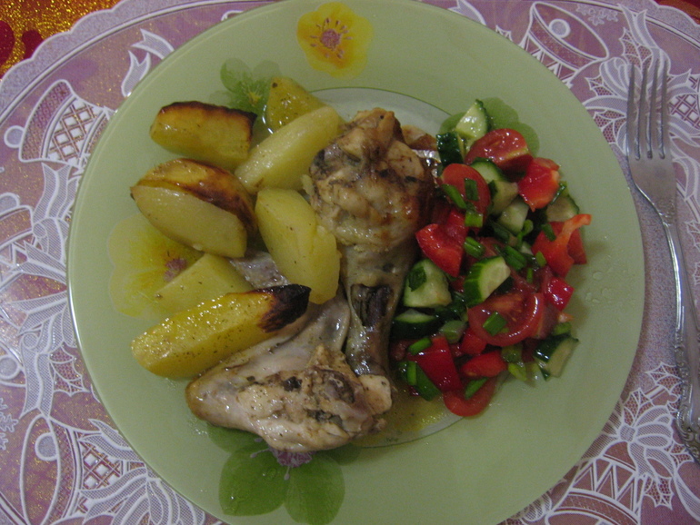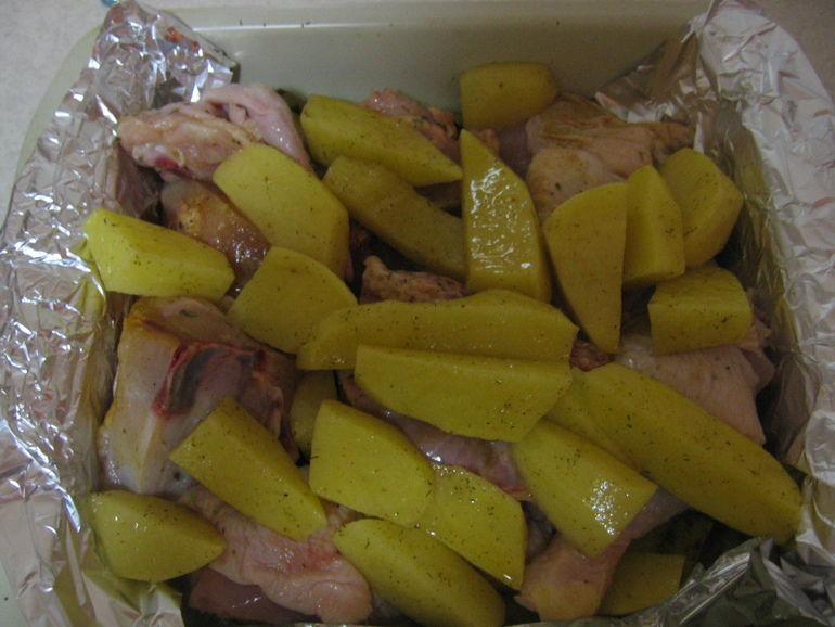 Картошку обсыпала специями, солью и полила маслом оливковым. Все перемешала и дала постоять минут 15. Курицу тоже обсыпала солью и специями, добавила чуть уксуса и воды (хотела в майонезе сначала замариновать, но подумала, что жирновато) и постояло тоже минут 15.