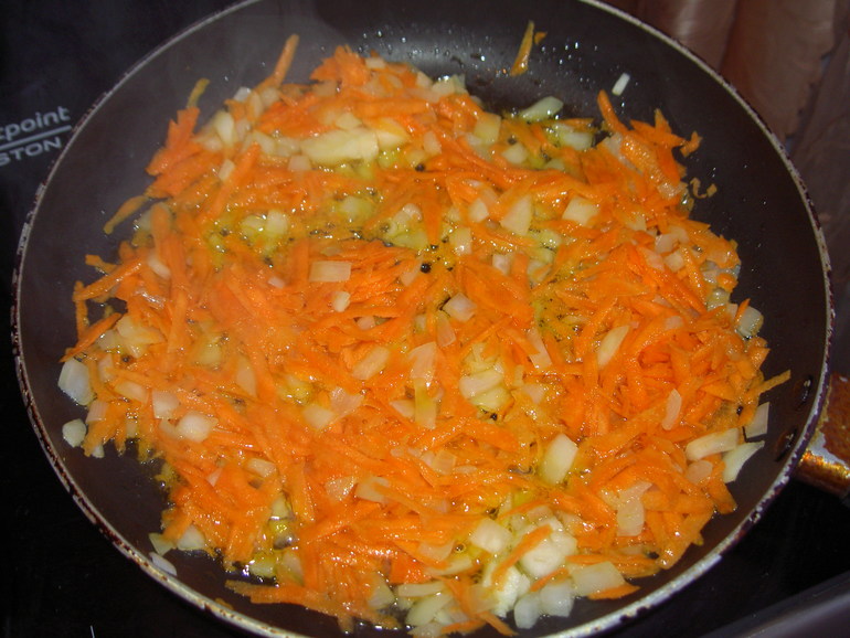 Пока наш горох варится, сделаем зажарку для супа. Лук мелко нарезать, морковь натереть на крупной терке. Выложить лук и морковь в сковороду с разогретым растительным маслом и пассеровать минут пять, не забывая помешивать: