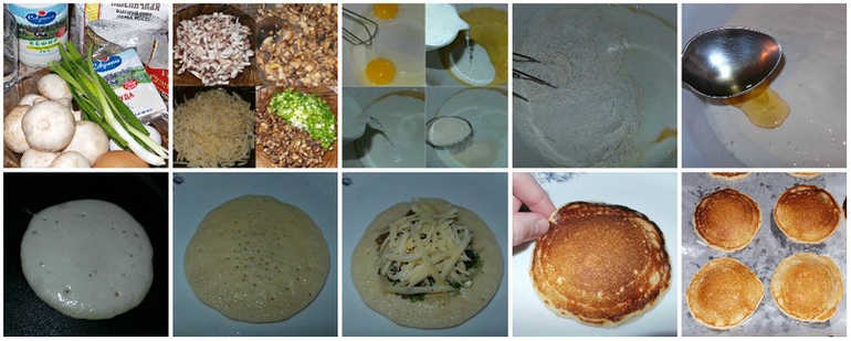 Блины с пропечённой стороны получаются невероятно бархатистыми, так и хочется их гладить)) А структура у них мягкая-мягкая.В центр блина кладём грибы с луком. .Посыпаем натёртым сыром