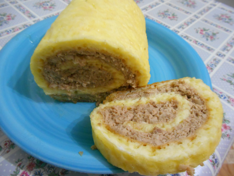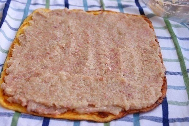 Мои замечания:я брала 2 порции "теста", и то на всю противень этого не хватало. Лук я не жарила, а перетёрла всё вместе в мясорубке с мясом. Тоже получается вкусно. Делала с куриной грудки - мясо получается немного суховато, но для холодной закуски хорошо подходит, делала 50/50 свиной фарш/куриная грудка, в горячем виде получается более сочный рулет, но тогда не так вкусно в холодном виде.