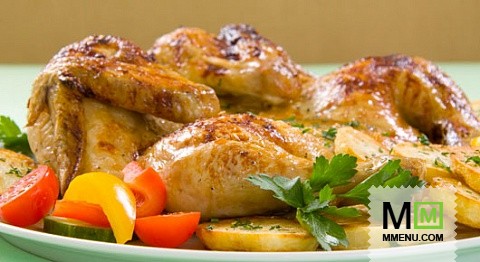 3. Жаровню с курицей накройте фольгой и запекайте 1 час при 160°С. Фольгу снимите. За 10 минут до готовности полейте курицу апельсиновым соком, смешанным с медом.
