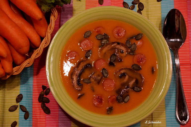 * разливаем суп по тарелкам, посыпаем семечками, добавляем сосиски, сдабриваем любимым ароматным маслицем (подойдёт подсолнечное не рафинированное, оливковое, тыквенное, масло орехов и т.д)![]()