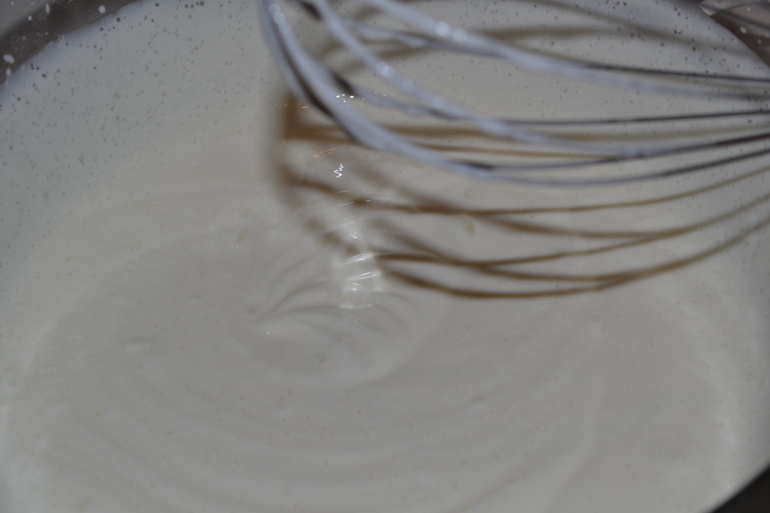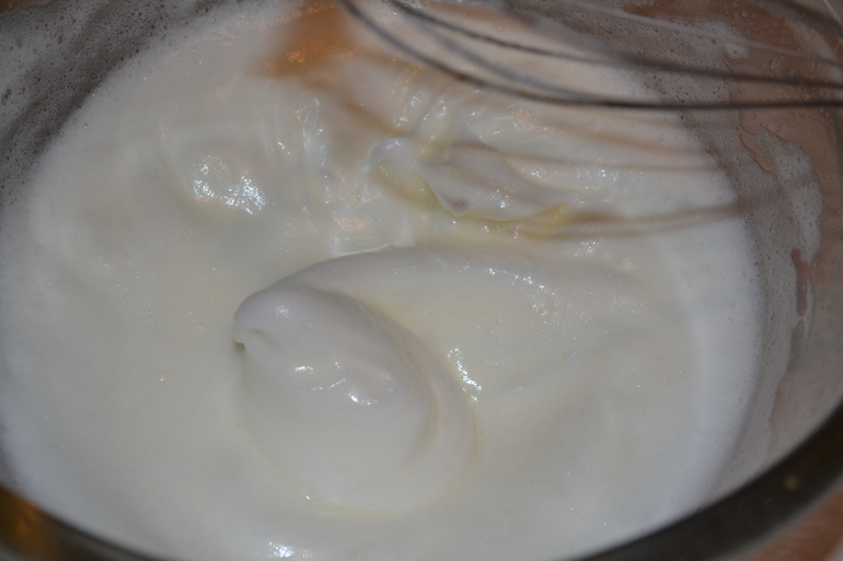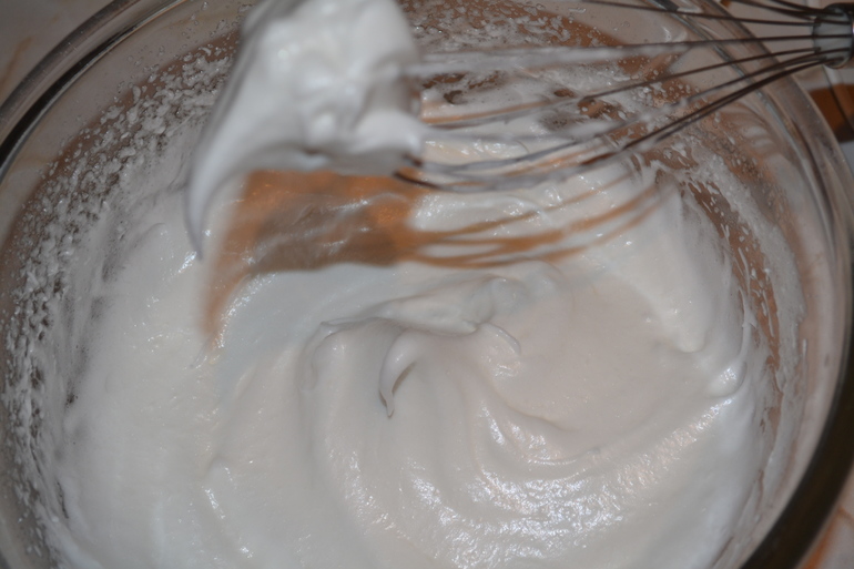 постепенно добавлять сахар и продолжать взбивать до устойчивых пиков.