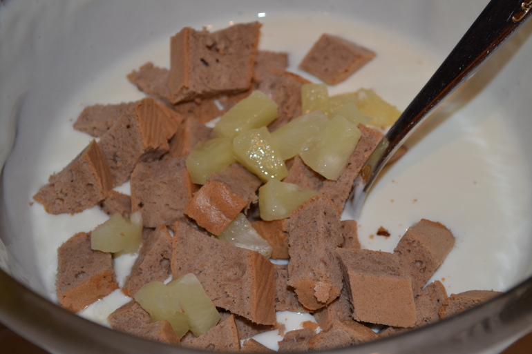 Достаем крем, откладывает 1/3 общего объема (для завершающего штриха), высыпаем в него нарезанные кусочки, туда же добавляем ананасы, тщательно перемешиваем.