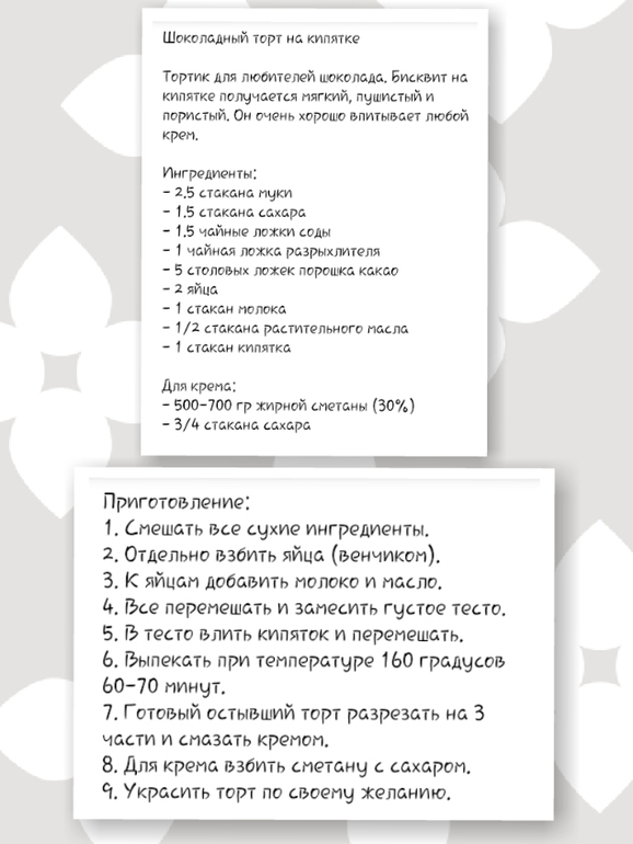 Фета в Кулинарное сообщество 11 лет Шоколад на кипятке Печенья, пирожные, торты, пончики, кексы Очень вкусно и оооочень просто;) Посмотрите еще 20 записей на эту тему Отменить Ответить Mariy Спасибо вам большое,как раз искала этот рецепт! 21.10.2015 Ответить Фета Не за что. Рада что пригодилось! 21.10.2015 Ответить Юля Спасибо! Мужу понравилось :) 03.03.2015 Ответить Фета Очень рада :) 04.03.2015 Ответить Пушистая А можно этот рецепт без какао делать? 27.02.2015 Ответить Фета Возможно, но я не пробовала. 28.02.2015 Ответить МамаКсю я пробовала, очень даже ничего. 28.02.2015 Ответить Фета Надо будет тоже попробовать без какао;) 28.02.2015 Ответить Eлена Меня тоже интересует, кипяток должен быть прямо крутым или подостывшим уже? 27.02.2015 Ответить Фета Я добавляю сразу как закипел 28.02.2015 Ответить Ольга А кипяток нужно добавлять горячий или остывший? 27.02.2015 Ответить Фета Я добавляю горячий 28.02.2015 Ответить МамаКсю Мой любимый рецепт. На его основе можно делать разные торты. Быстро и вкусно! 27.02.2015 Ответить Фета Ну да меняй крем и украшение, и каждый раз новый будет :) 27.02.2015 Ответить Тортик Воздушный бисквит Чаты Беременных Выберите чат: Январята-2026 Февралята-2026 Мартята-2026 Апрелята-2026 Майчата-2026 Июнята-2026 Июлята-2026 Августята-2026