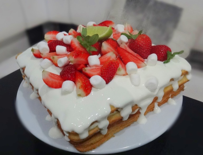 Каждый корж перемазываем кремом, сверху ягоды или любое украшение на ваш вкус..