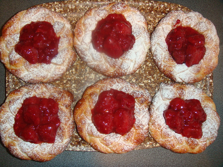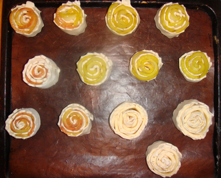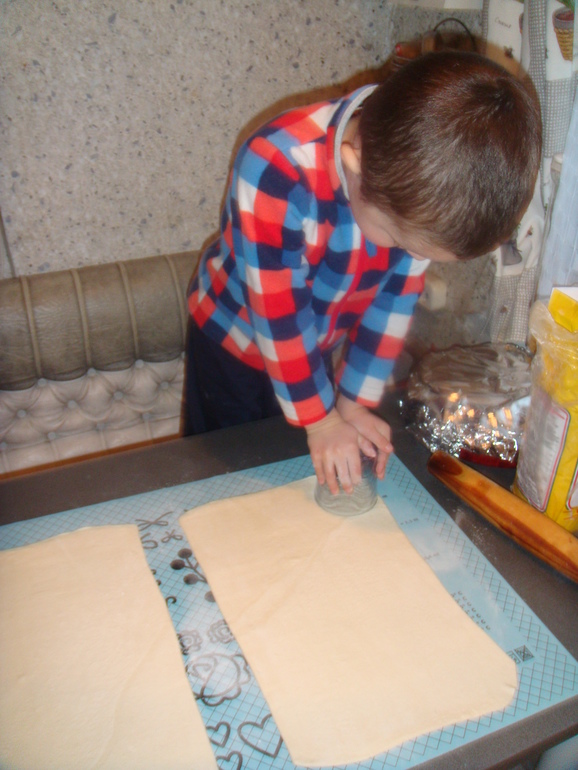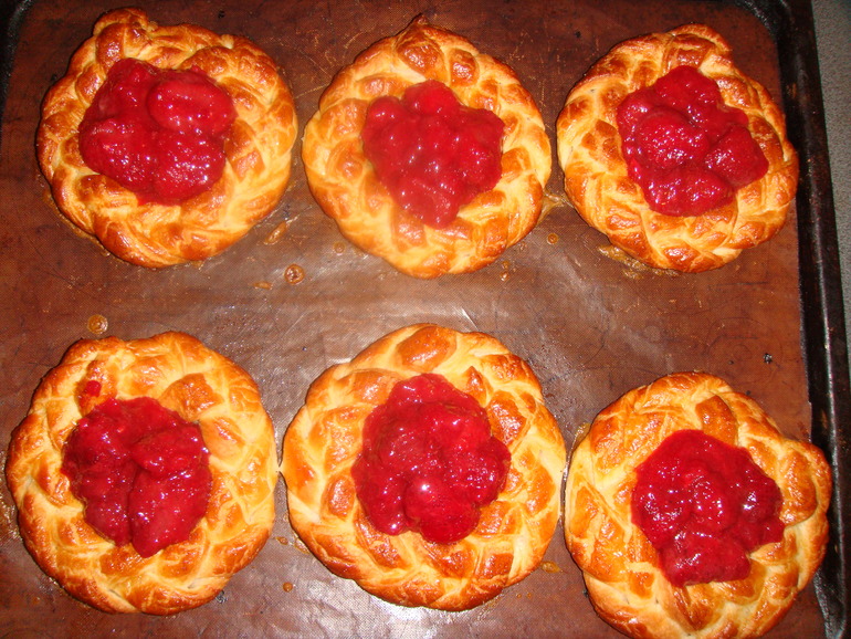Слоеное дрожжевое тесто немного раскатать. Из одного пласта нарезать стаканом кружки, разложить на противне:
