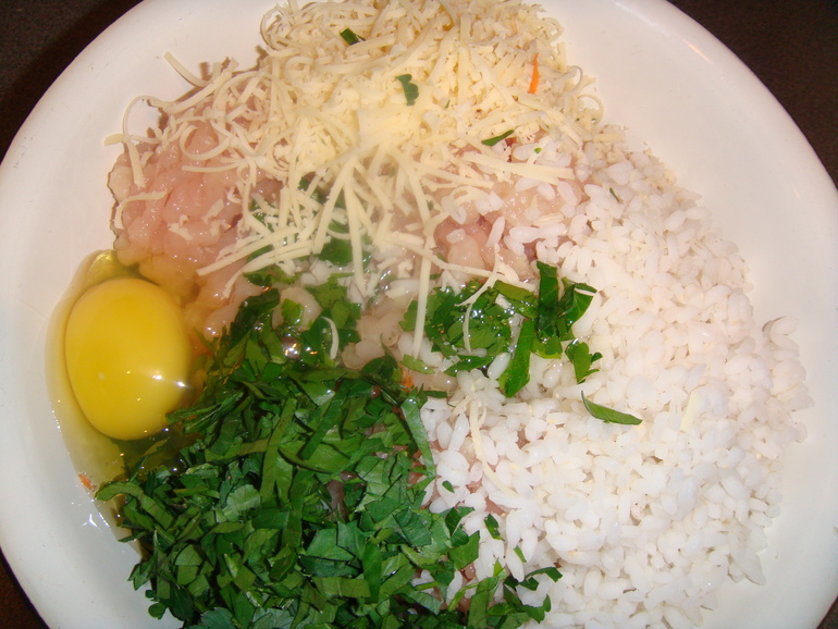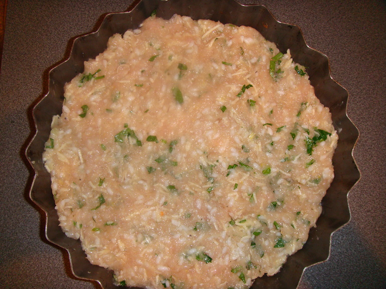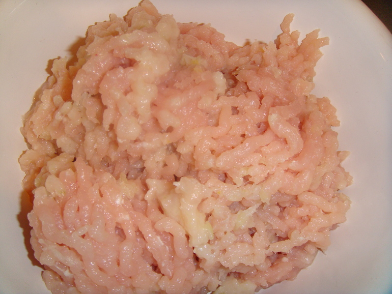 Отварить пол стакана риса до полуготовности. Смолоть куриное мясо (1 большая грудка или 2 окорочка) и 1 луковицу: