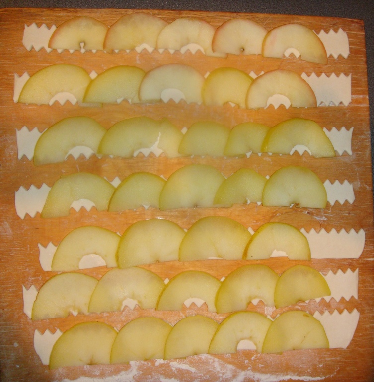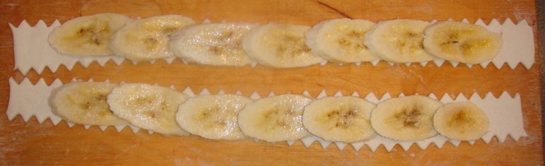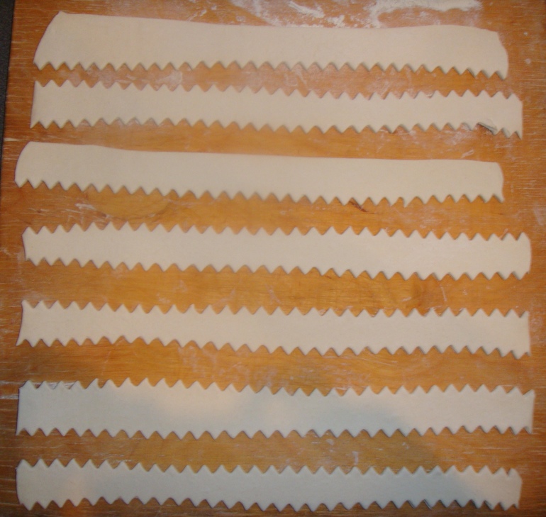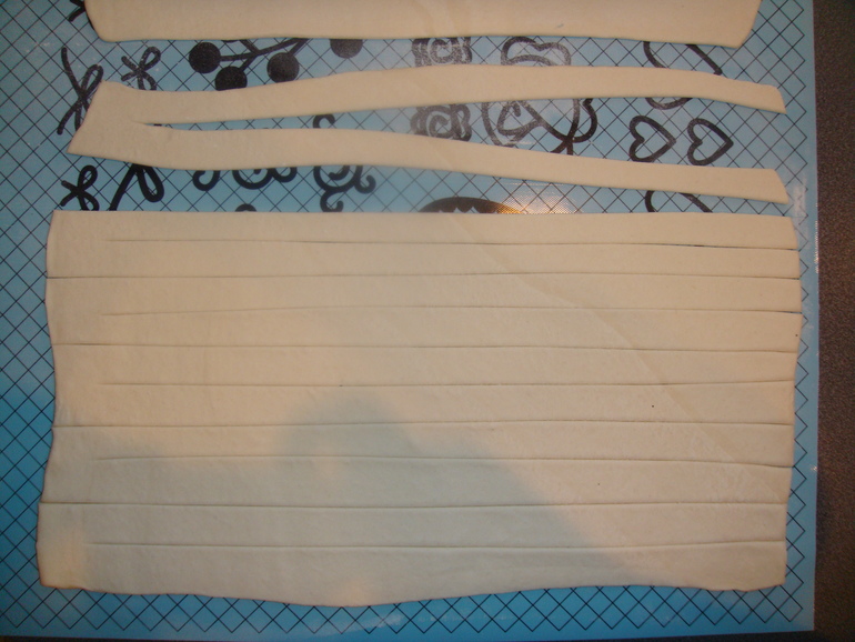 Слоеное бездрожжевое тесто немного раскатать, нарезать на полоски в 2 см: