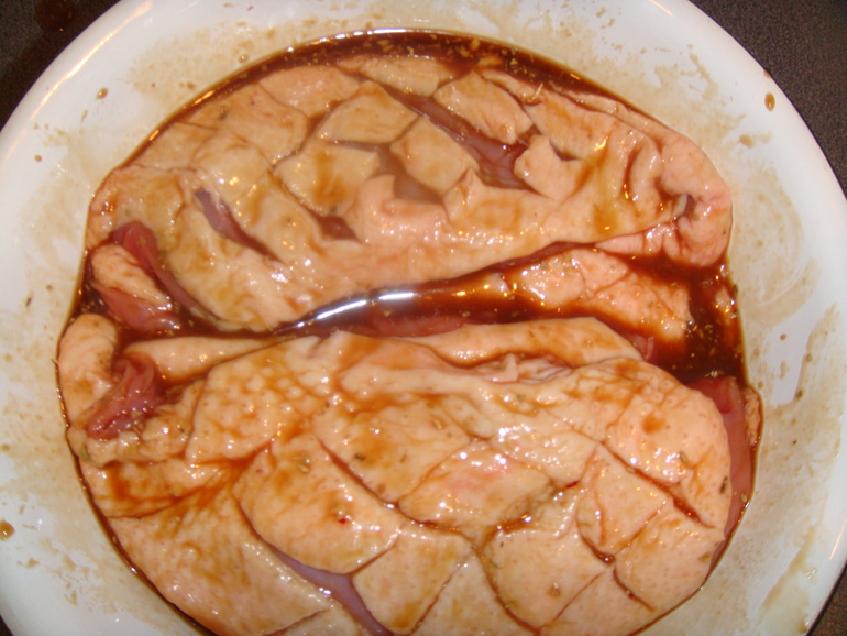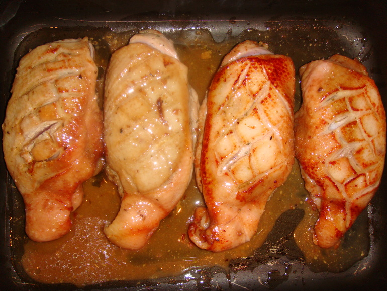 Приготовить маринад из 1 ч.л. сладкой горчицы, 3 ст.л. соевого соуса, щепотки орегано, 1 ст.л. меда. Мариновать минимум час (я оставляю на ночь):