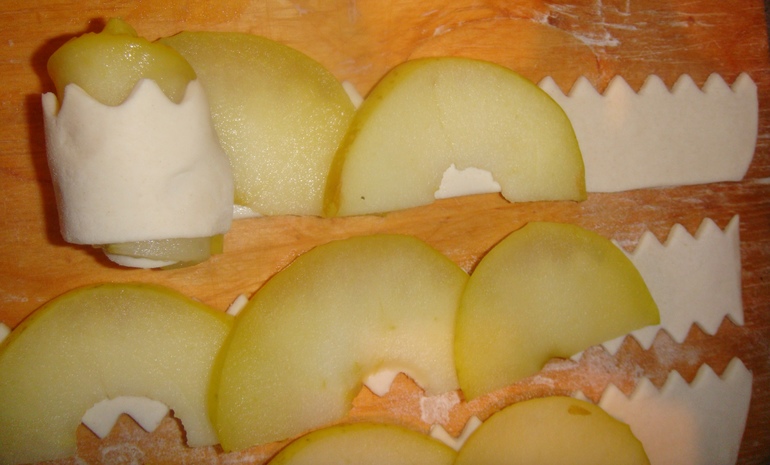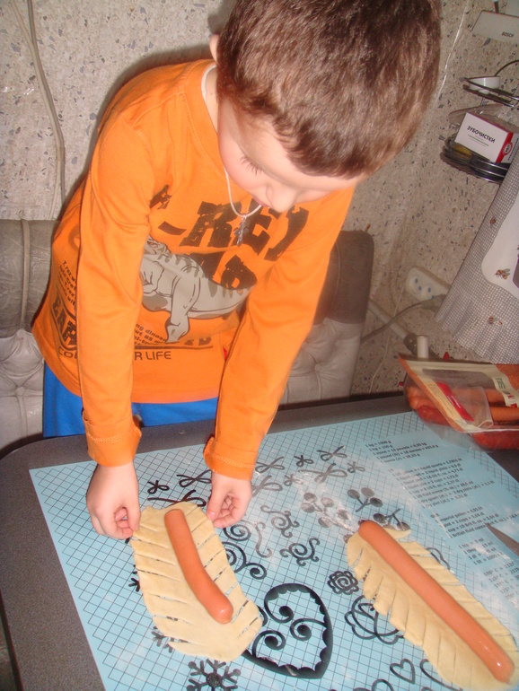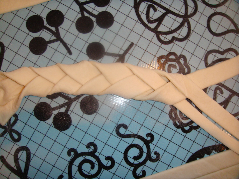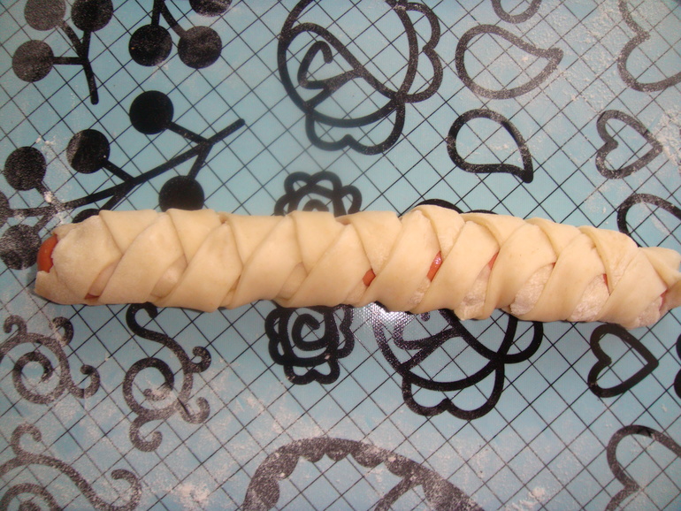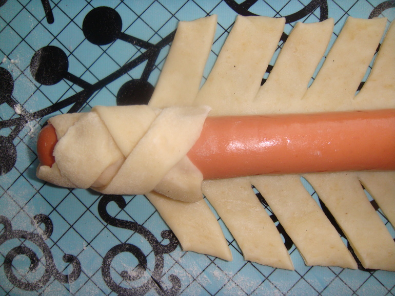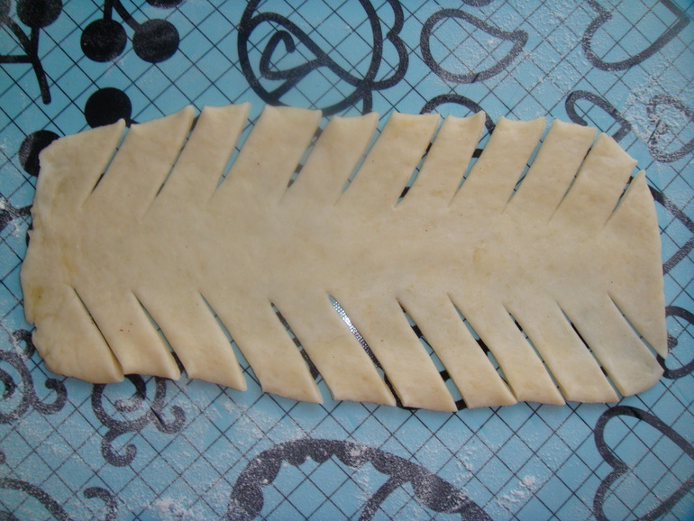 Дать тесту постоять 15 минут в теплом месте. Разделить на 8 шариков. Раскатать один шарик длинным овалом, сделать через каждый сантиметр надрезы: