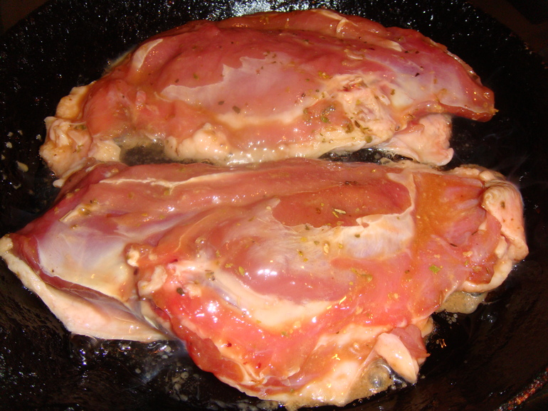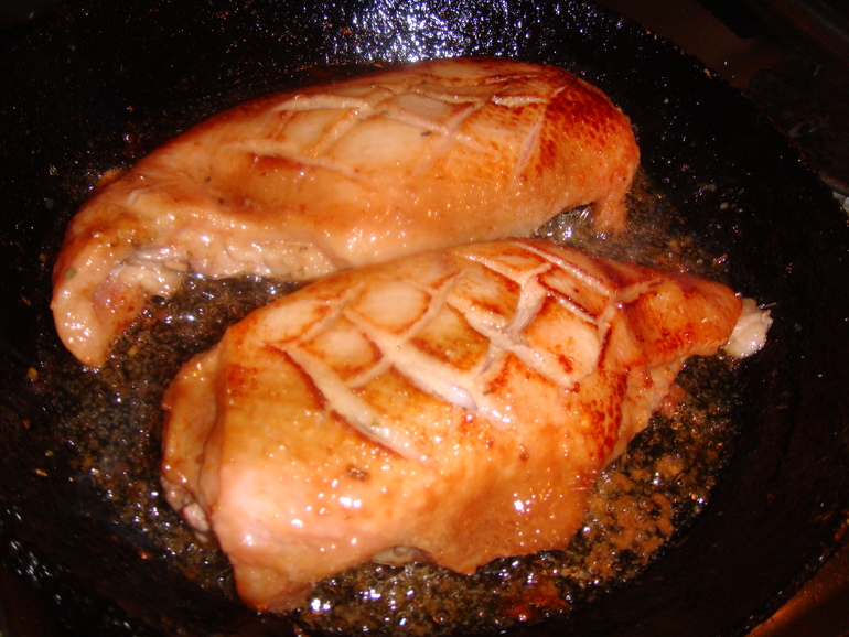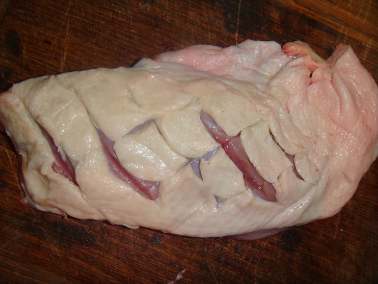 Быстро обжарить на раскаленном растительном масле сначала шкурку: