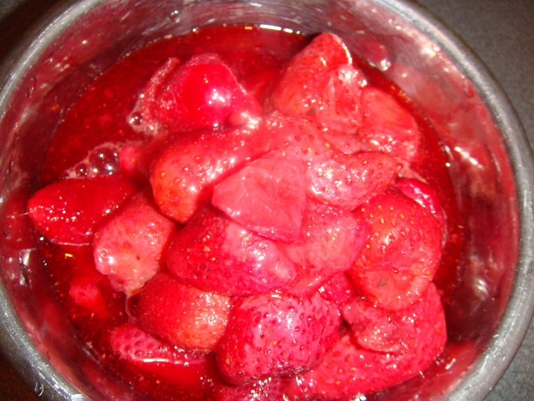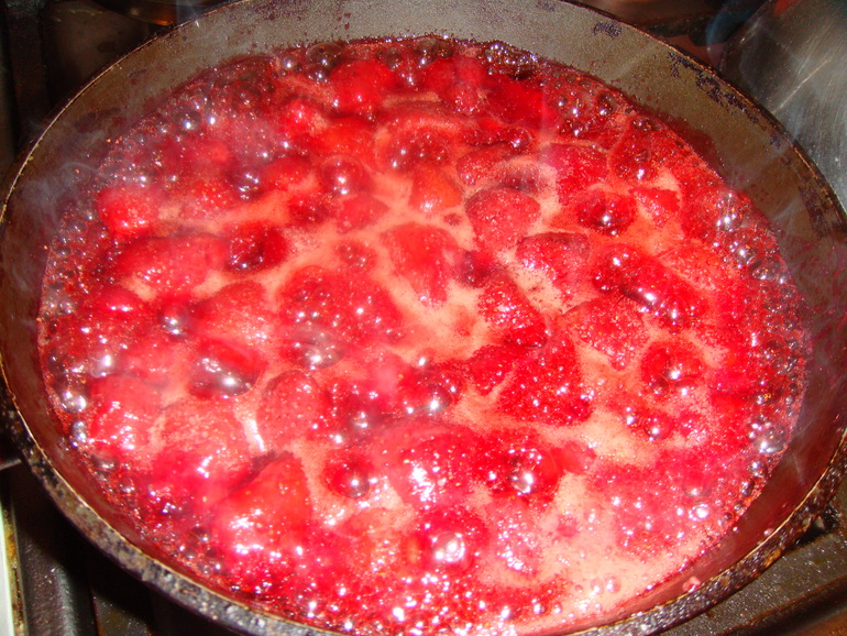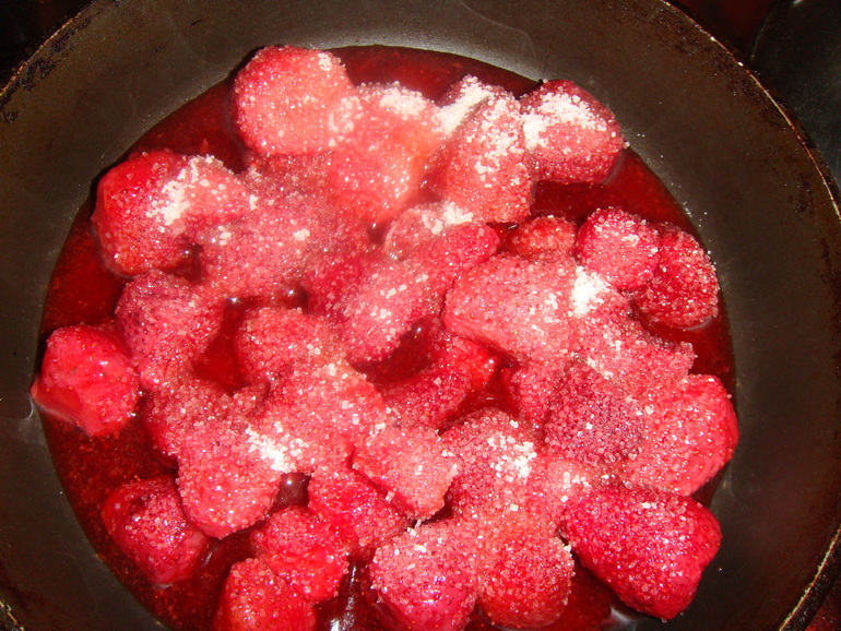 Слить сок. Ягоды переложить на сковородку, засыпать сахаром, перемешать: