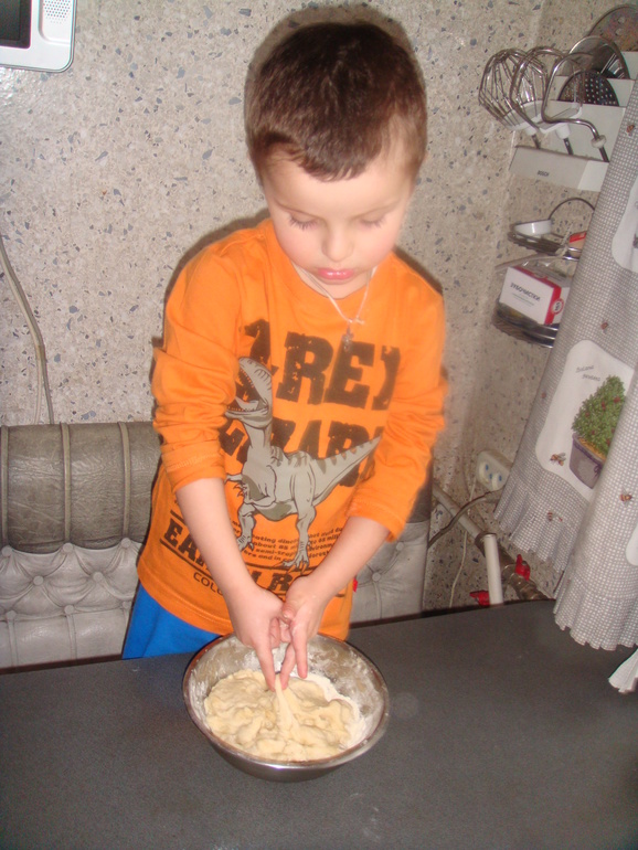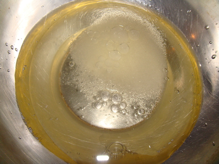 в 200 мл теплой воды добавить 1 ч.л. сахара, щепотку соли, 5 ст.л. растительного масла: