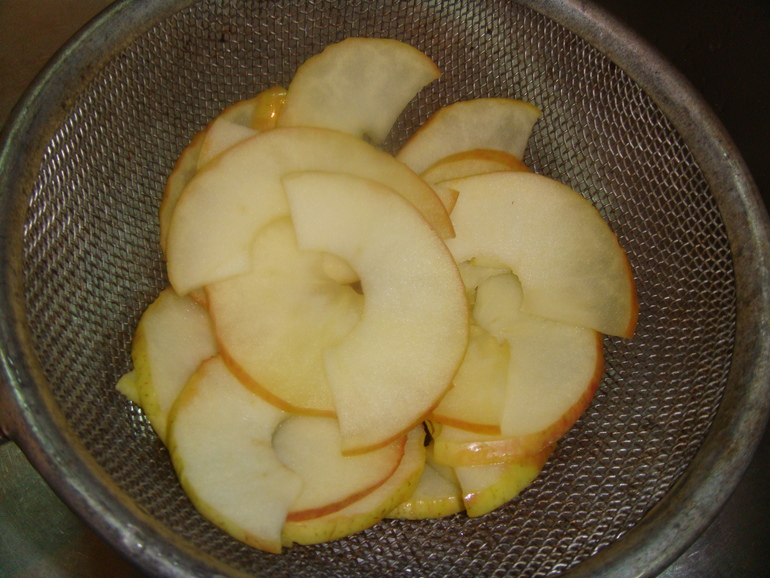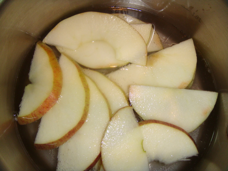 Яблоки порезать, очистить,отварить по 1 минуте в сладком сиропе: