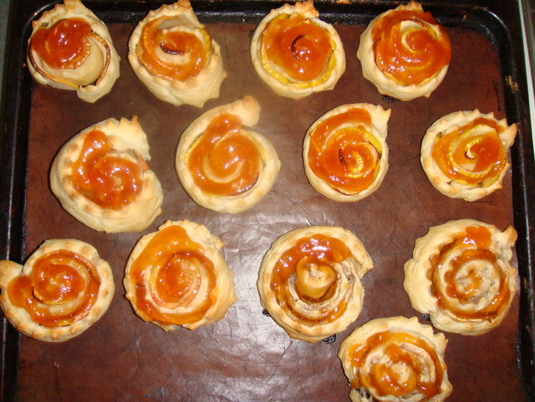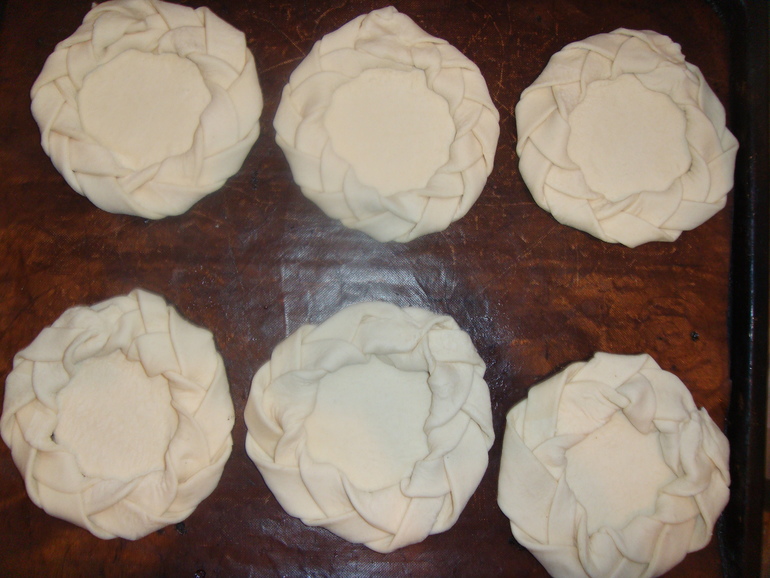 Разложить на противне, смазать яйцом. Дать подойти 15-20 минут. Выпекать в хорошо прогретой духовке до румяности: