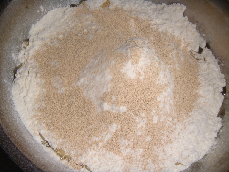 Всыпать 2 стакана муки и 1 ч.л. сухих дрожжей:
