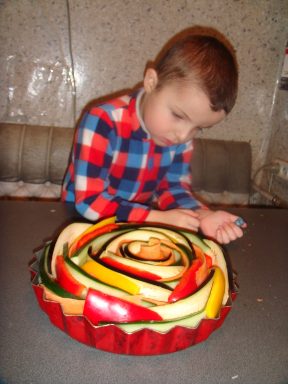 Предлагаю приготовить запеканку "радуга", утиную грудку, плетенки с клубникой, розочки с яблоками, заплетенные сосиски.