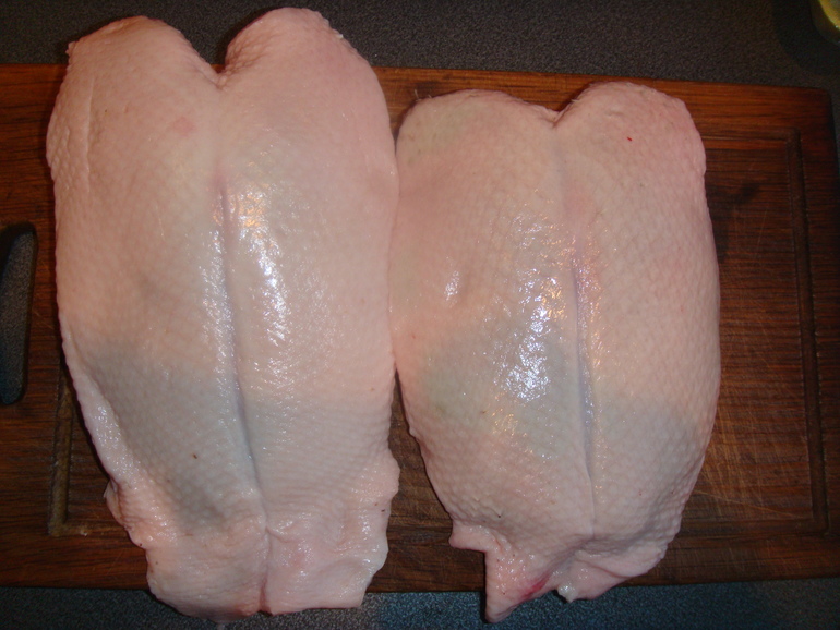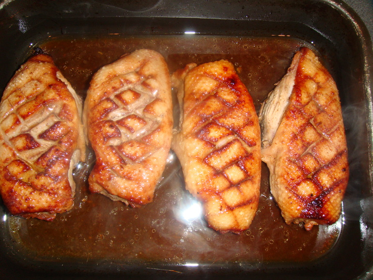Втереть маринад в утиные грудки и оставить мариновать на час: