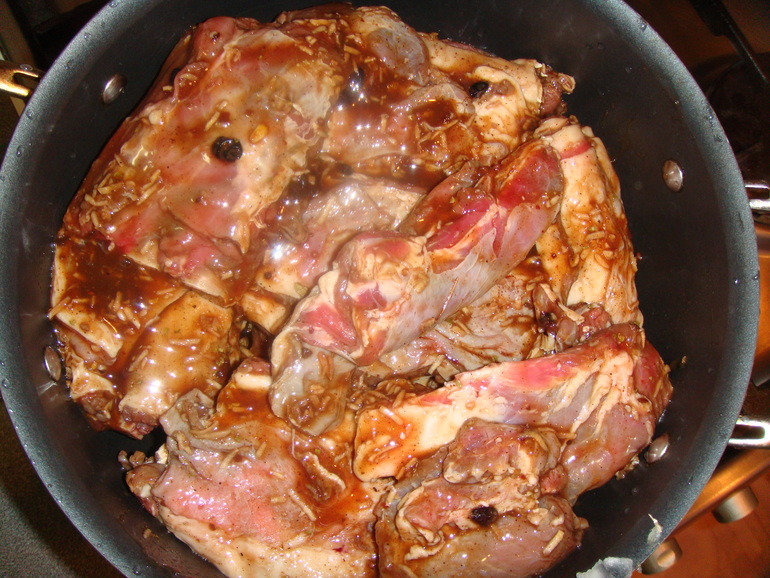 Приготовить маринад из лимонного сока, чеснока, имбиря, паприки, барбариса, соевого соуса, аджики, майорана: