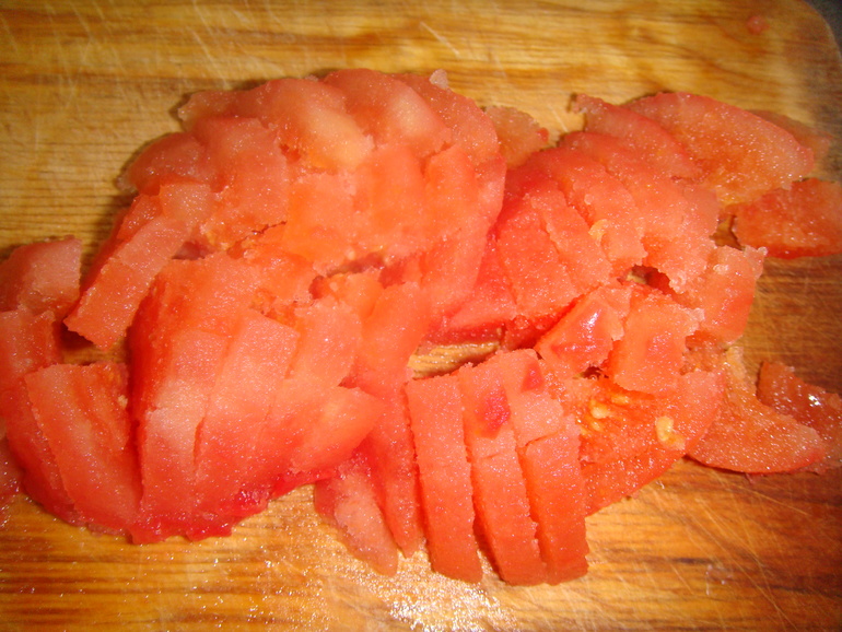Нарезать помидоры (можно замороженные), добавить в сковороду: